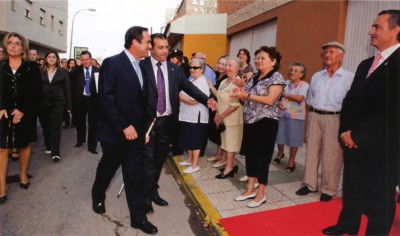 La procesión cívica Una vez concluido el pleno extraordinario del Ayuntamiento de Alhama en el frontón municipal, pasadas las ocho de la tarde, se puso en marcha la procesión cívica encabezada por José Bono, el alcalde con los concejales de la Corporación municipal de Alhama y otras autoridades que asistieron al acto. Le seguían todas las personas, la mayoría vecinos de Alhama, que se encontraban dentro y también fuera del frontón. Cerraba la comitiva la banda de música de de Alhama, que interpretó los pasodobles Borosco, Xabia, Orgía dorada y Ganando Barlovento. Al paso de la comitiva por la calle principal de Alhama que une el frontón con la casa de Nicolás Salmerón en el Paseo -recorrido de unos 800 metros-, muchas personas aprovecharon la ocasión para asomarse a balcones y terrados para saludar a José Bono y manifestar su admiración por Nicolás Salmerón, gesto que nos recuerda aquellos recibimientos que vivió Salmerón cada vez que cruzaba la localidad vecina de Gádor cuando llegaba en tren en sus viajes a Alhama a principios del siglo XX. La procesión transcurrió con paso ligero, como si nadie quisiera perderse algo importante que quedaba por ver y escuchar. Quedaba por asistir a los momentos más emotivos del día frente a la casa de Nicolás Salmerón y junto al monumento que encumbra su busto, erigido en su memoria el 20 de diciembre de 1928. Ésta culminó con la entrada a la casa de las autoridades más significativas y con el agrupamiento del resto de los participantes frente a la fachada principal de la casa, que se mezclaron con otro numeroso grupo que ya se encontraba allí a la espera del homenaje más íntimo. Esta procesión nos recordaba aquellas otras que se vivieron en Alhama con anterioridad, la que se llevó a cabo en el homenaje que el 20 de septiembre de 1931 se le tributó, y aquella otra, más reciente, que tuvo lugar el 4 de abril del 2003 con motivo del centenario de la constitución de Unión Republicana en torno a la jefatura de Nicolás Salmerón, iniciándose en esta última ocasión el recorrido desde el propio Ayuntamiento y siendo encabezada por la banda de música y varias banderas.